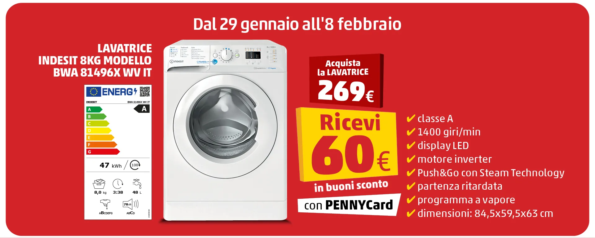 Acquista la LAVATRICE INDESIT 8kg con PENNYCard e ricevi 4 buoni da 15€