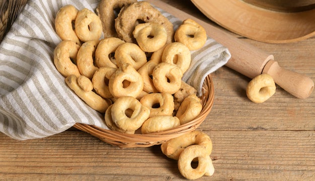 I taralli sono deliziosi anelli di pasta di pane non lievitata bolliti e successivamente cotti in forno. L'impasto è molto semplice: farina, vino bianco, olio extra vergine d’oliva e sale.