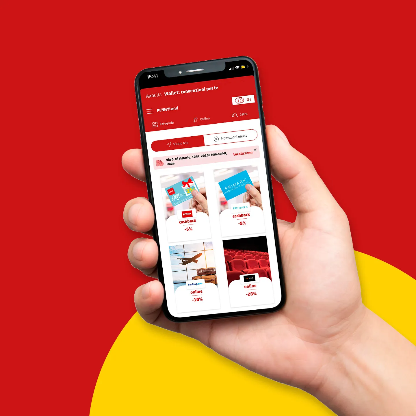 Puoi trovare la sezione PENNYWallet nell'area Vantaggi, una volta che hai effettuato l'accesso al tuo profilo nella PENNY APP.