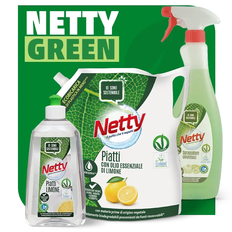 Per i più esigenti Inoltre, i prodotti Netty Green sono formulati con materie prime di origine vegetale, completamente biodegradabili e provenienti da fonti rinnovabili. Sono certificati Ecolabel e Vegan ok. Testati per nichel, cromo, cobalto e piombo <0,0001%.