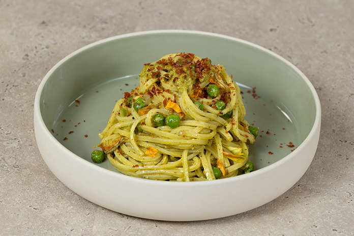 Tagliolini con piselli, fior di zucca, polvere di prosciutto croccante & pesto