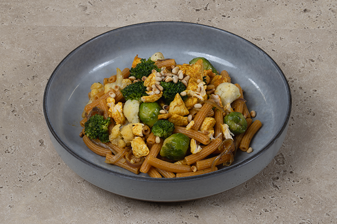 Sedanini di lenticchie rosse con broccoli & sfilacci di pollo speziato