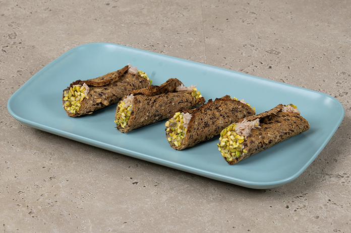 Cannoli di pane proteico, crema di cannellini, tonno & pistacchi