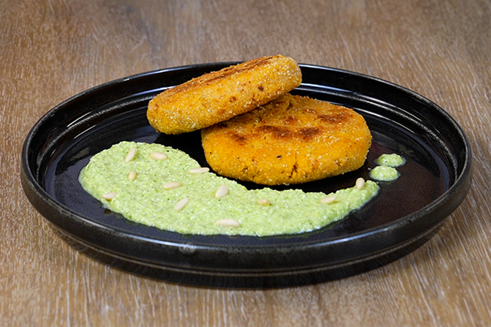 Burger di ceci & fagioli con salsa di zucchine & pinoli a crudo