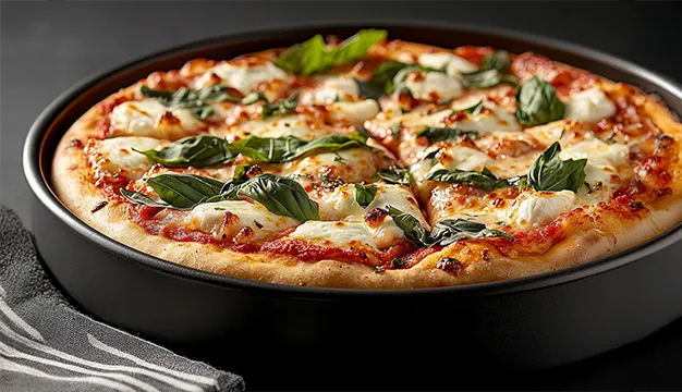 - Passaggio 5Condisci la pizza al padellino come una classica margherita, con pomodoro e mozzarella. Cuoci nel ripiano più basso del forno statico preriscaldato alla massima temperatura (250 °C) per circa 20 minuti, o comunque finché la base non sarà ben dorata.