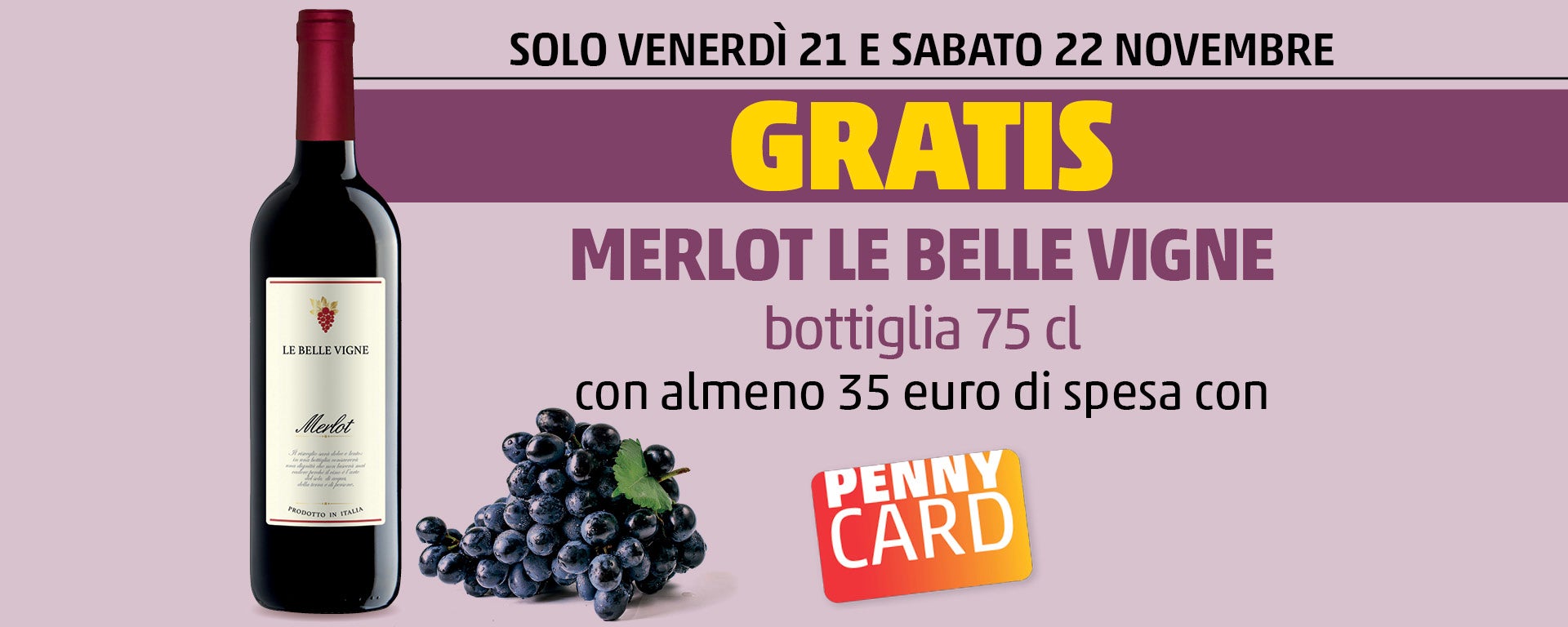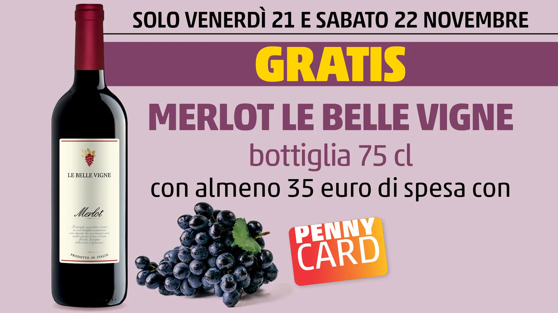 Operazione a premi valida dal 21 novembre al 22 novembre 2025. Spendi almeno 35€ con PENNYCard per avere gratis 1 bottiglia di Merlot da 75cl. L'importo minimo della spesa non comprende ricariche telefoniche, gift card, carte prepagate, cofanetti Emozione3, cassette frutta e verdura “Ancora più buoni”, Surprise bag Too Good To Go. Massimo 1 pezzo per contrino. Clicca qui per consultare il regolamento completo.