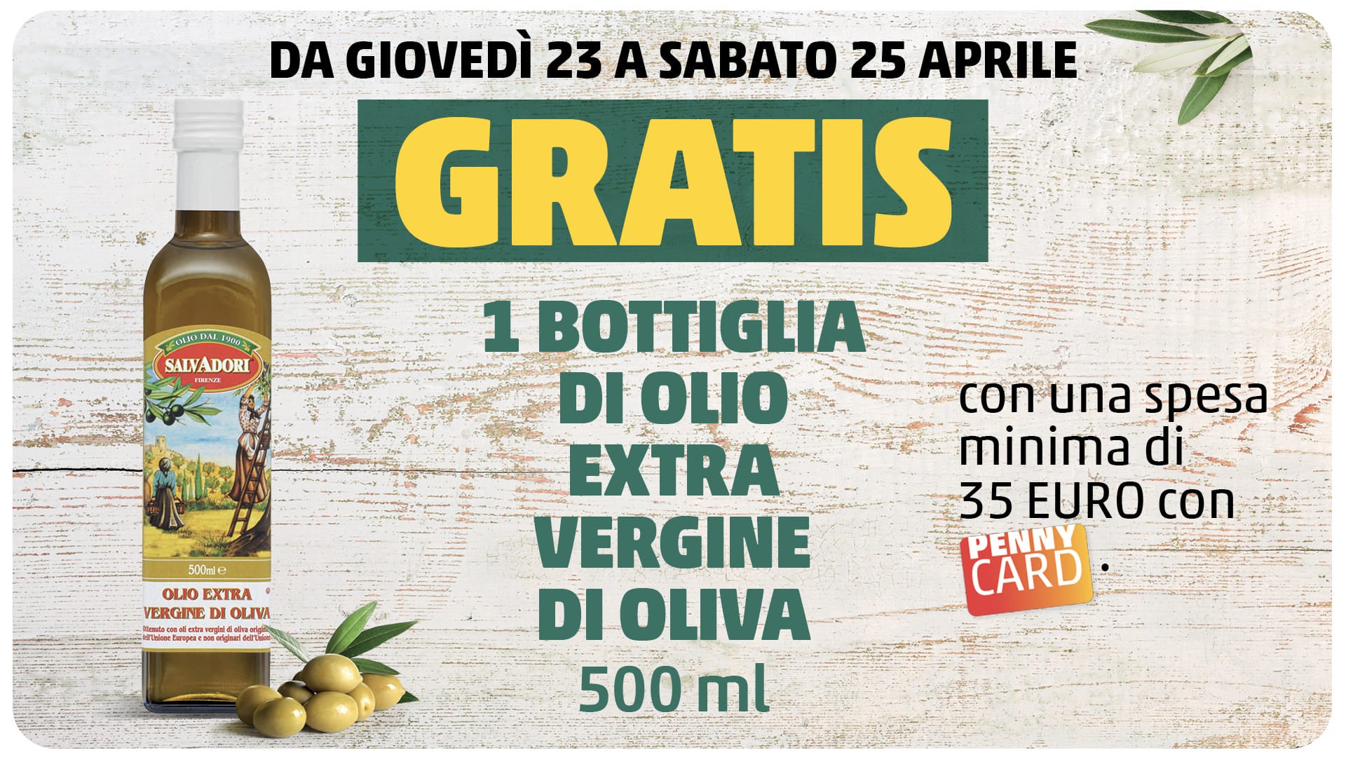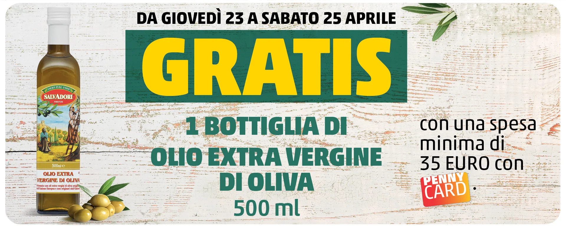 Operazione a premi valida dal 23/04/2026 al 25/04/2026. Spendi almeno 35€ con PENNYCard per avere gratis 1 bottiglia di olio extra vergine di oliva da 500ml. L'importo minimo della spesa non comprende: ricariche telefoniche, gift card, carte prepagate, cofanetti Emozione3, premi della collezione, cassette frutta e verdura ''Ancora più buoni'', Surprise bag ''Too good to go''. Massimo 1 pezzo per scontrino.