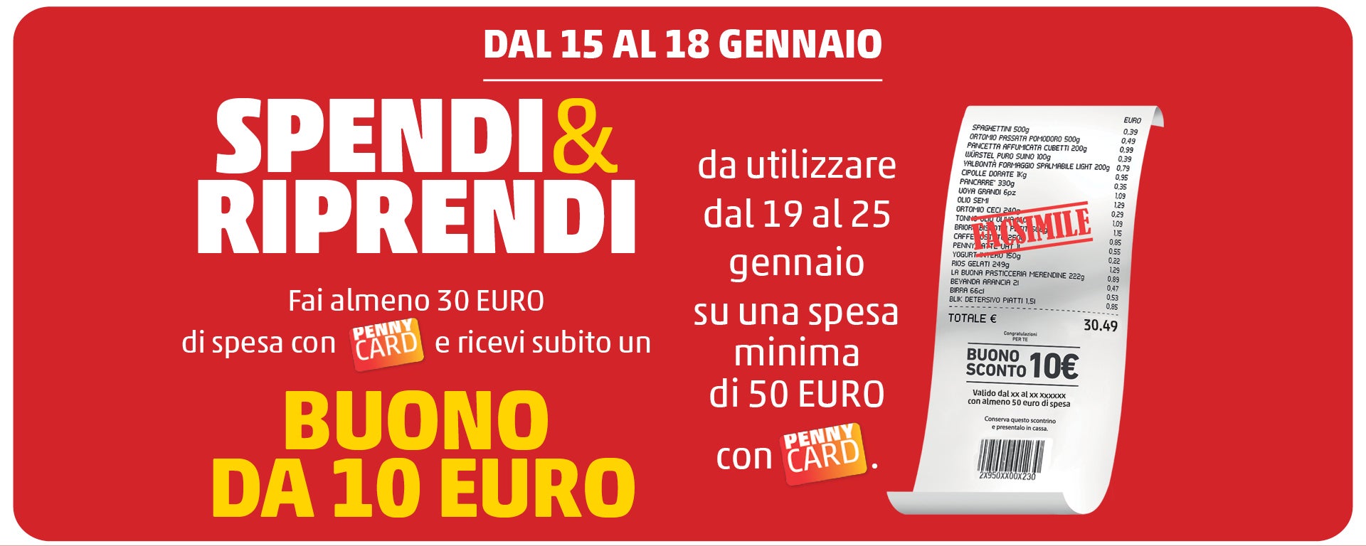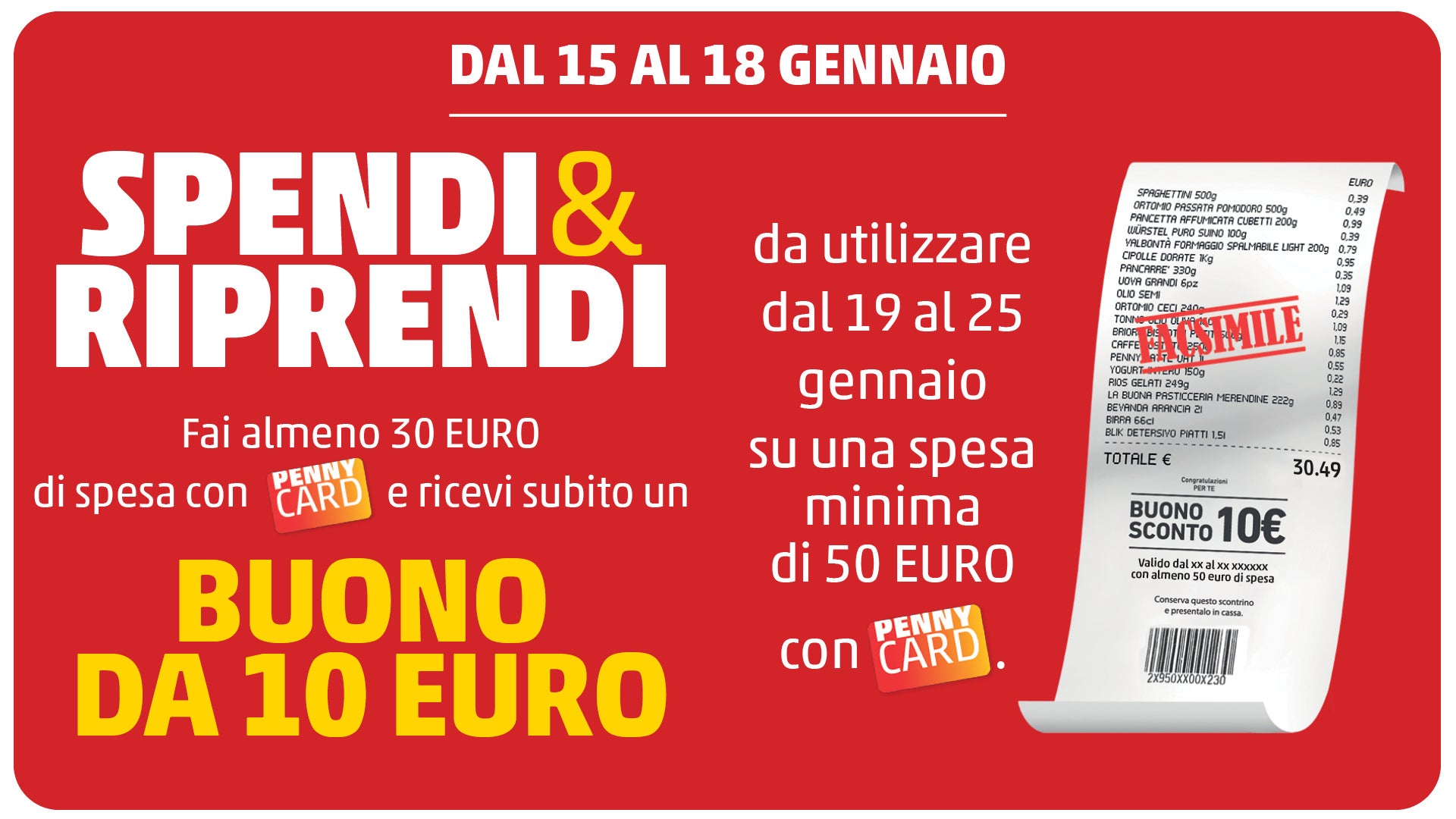 Il buono sconto verrà erogato sullo scontrino per un massimo di 1 buono a cliente e associato solo alla PENNYCard del cliente. È valido su una spesa minima di 50 euro, utilizzabile dal 19 al 25 gennaio. Non è valido sui prodotti già in promozione, non è cumulabile con altri buoni sconto ed è utilizzabile in un'unica soluzione. Eventuali limitazioni di utilizzo sono indicate sullo scontrino.